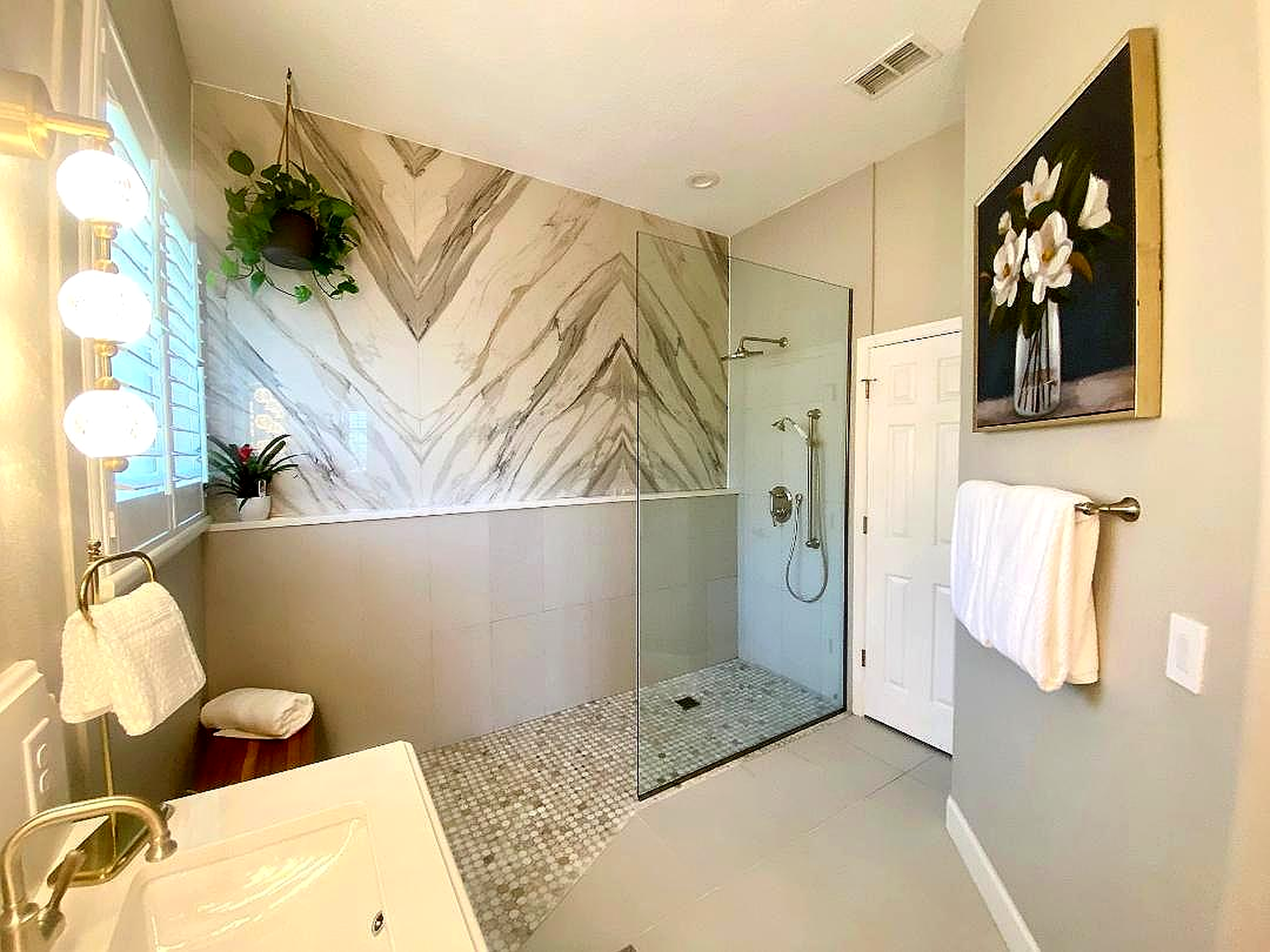 Midway through the project, the client, thrilled with our progress, asked if we could also renovate the guest bathroom. We were excited to take on the challenge, and for a minimal additional budget, we carried the French boutique vibe she loved into the space with a 3/4 remodel. We even added a touch of style to the guest bedroom, just because we couldn’t resist.