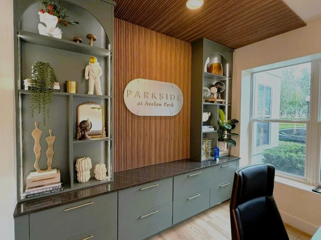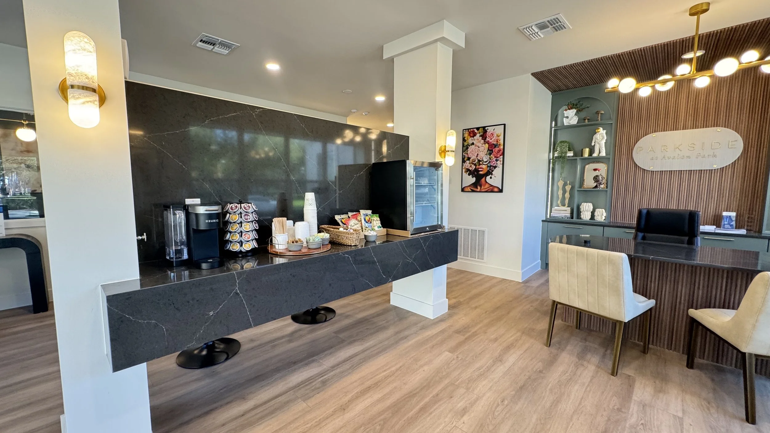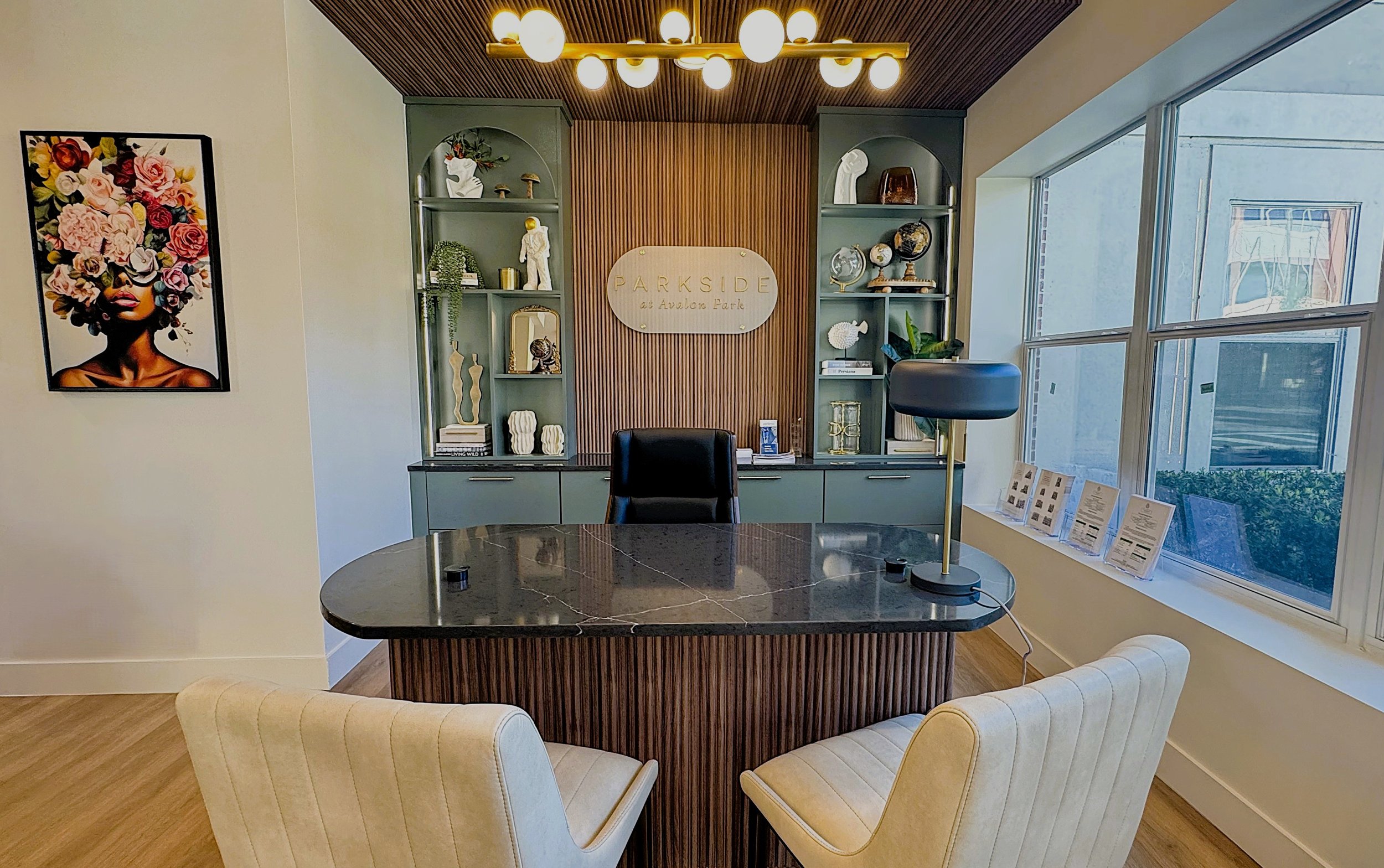 This new build was transformed into a statement-making leasing space that serves as the jewel of the property. The client needed a fully functional layout. Offices, a breakroom, and restrooms all needed to be tucked beneath residential apartments. I was happy to take on the entire scope, from concept through completion, handling space planning, lighting, cabinetry, fixtures, custom wood tambour, a bespoke reception desk, a coffee bar, finishes, furniture, and art.